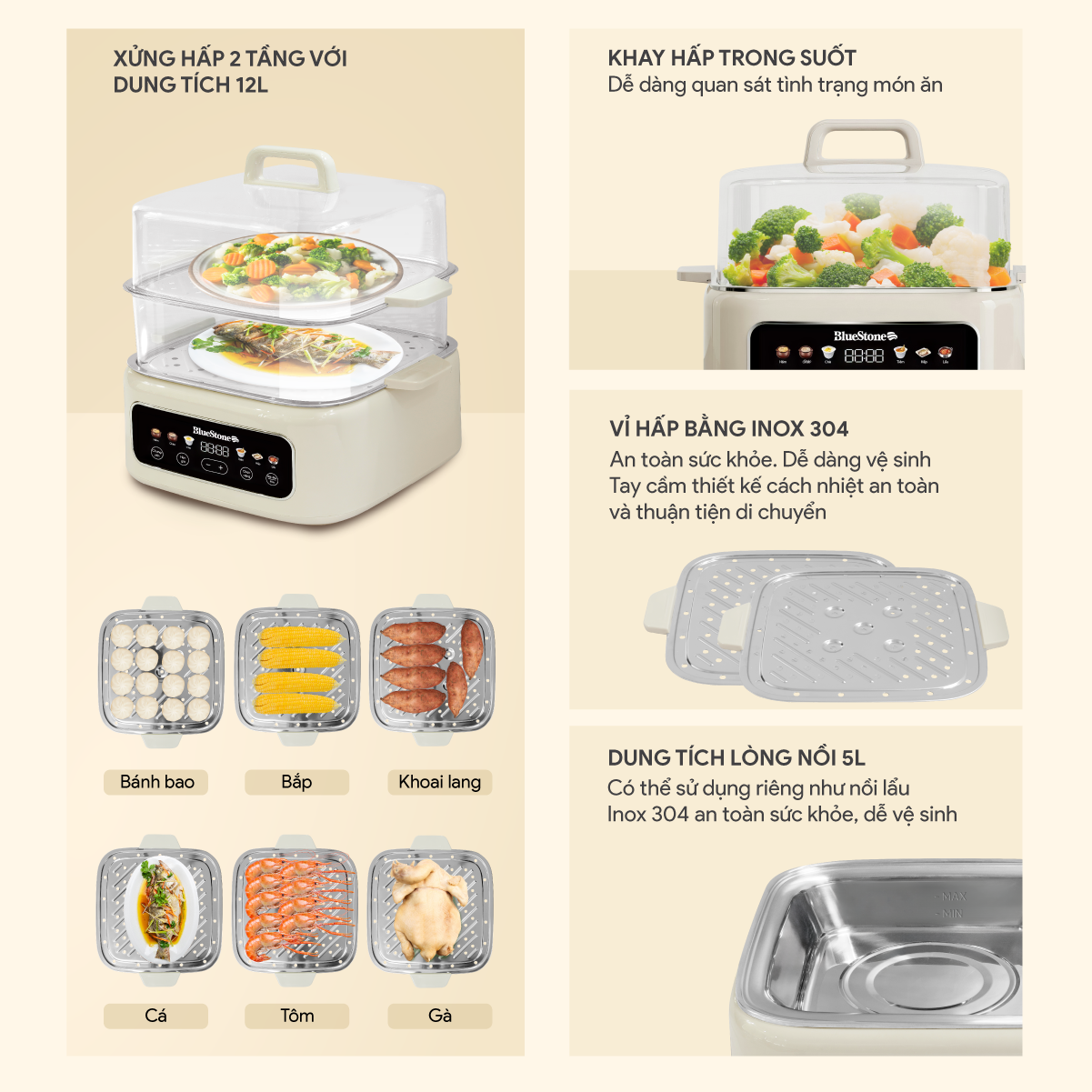 - Lòng nồi và vỉ hấp làm bằng Inox 304, an toàn và bền bỉ.