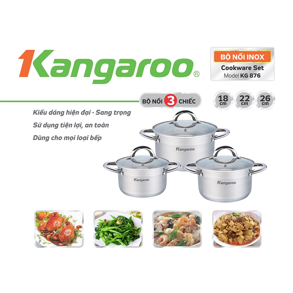Bộ nồi inox Kangaroo KG876 là sản phẩm gồm 3 nồi với các kích thước 18 cm, 22 cm và 26 cm sở hữu những tính năng vượt trội, xứng đáng là thiết bị không thể thiếu trong không gian bếp nhà bạn.Chất liệu inox cao cấp