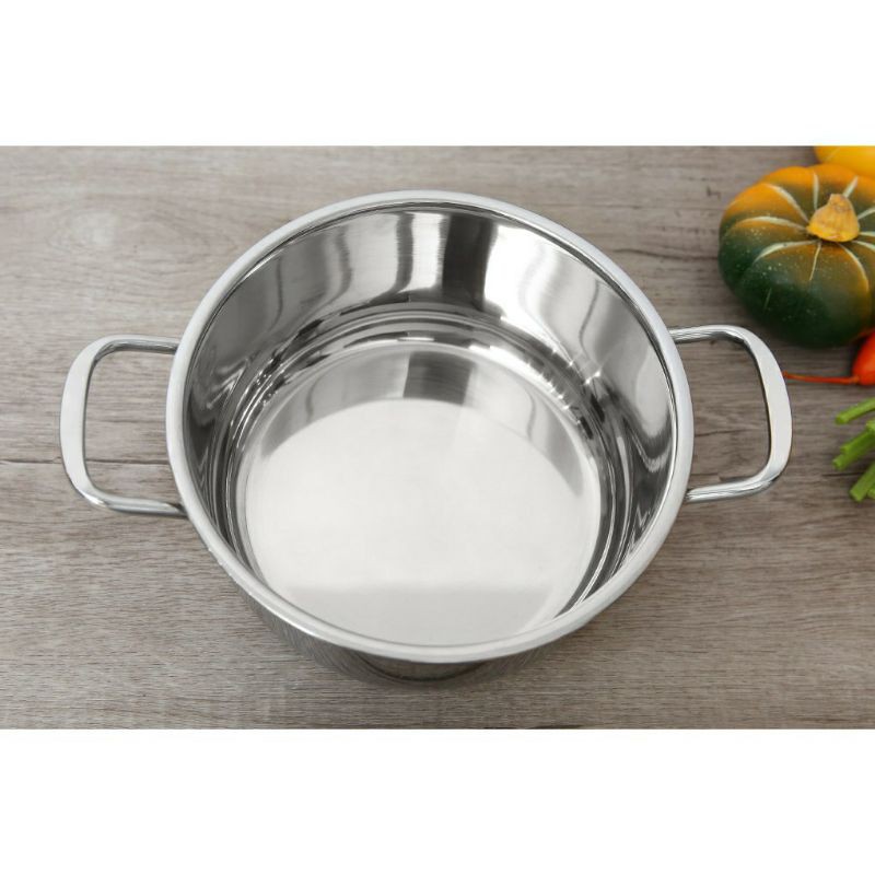 #Nồi được làm từ inox 430 chống o-xy hoá, thu nhiệt nhanh, toả nhiệt đều, giữ nhiệt lâu, chống cháy khét, dễ chùi rửa và ít hao nguyên liệu#Nồi-3-đáy rất dày, inox sáng bóng.