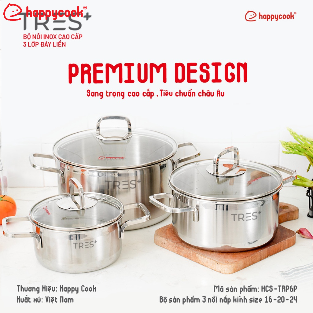 Giới thiệu [Mã BMBAU300 giảm 7% đơn 499K] Bộ nồi Inox cao cấp 3 lớp đáy liền Happy Cook Tres+ HCS-TRP6PC