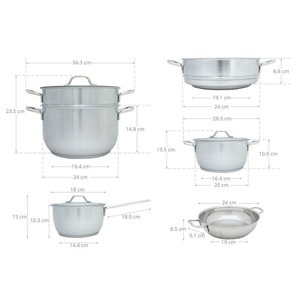 Bộ gồm 1 quánh 18cm, 1 nồi inox 20cm, 1 nồi inox 24cm, 1 chảo xào và 1 xửng hấp (để vừa nồi 20cm, chảo xào và nồi 24cm).