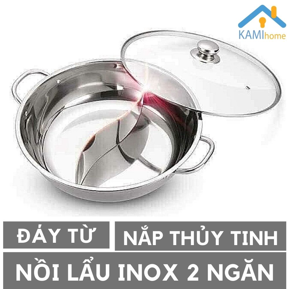Nồi lẩu 2 ngăn độc đáo Đáy từ Nắp kính chất liệu Inox cao cấp mã 20058