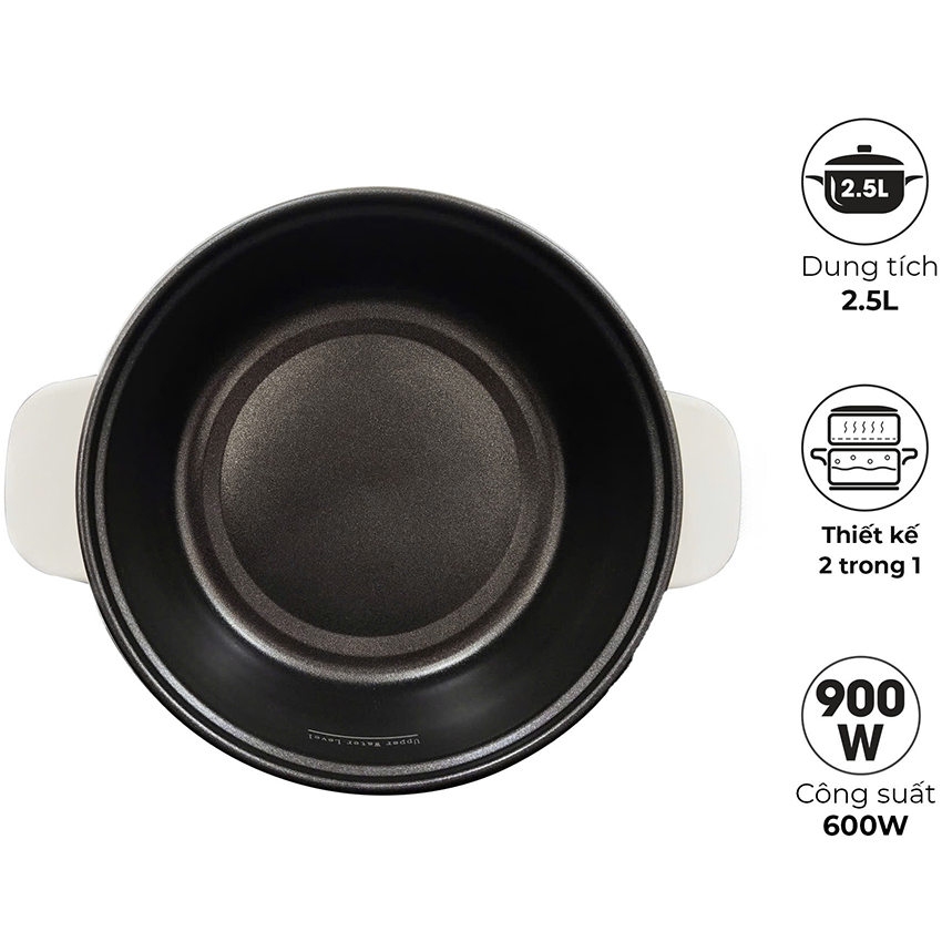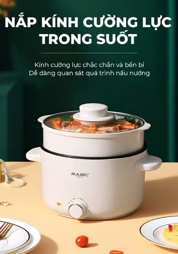 Nồi lẩu điện Magic nấu nướng đa dạng các món ăn với dung tích 2.5 lít Lòng nồi chống dính Teflon cao cấp an toàn khi sử dụng Nhựa PP chịu nhiệt cao cấp dễ dàng vệ sinh 2 trong 1 kết hợp lẩu và hấp nấu nướng tiện lợi hơn Công suất 900W nấu chín thức ăn nhanh, tiết kiệm thời gian 3 mức nhiệt điều chỉnh linh hoạt theo nhu cầu sử dụng Chế độ giữ ấm duy trì nhiệt độ ổn định từ 65-70°C Tay cầm cách nhiệt, nắp kính cường lực trong suốt Tự ngắt khi quá nhiệt an toàn khi sử dụng