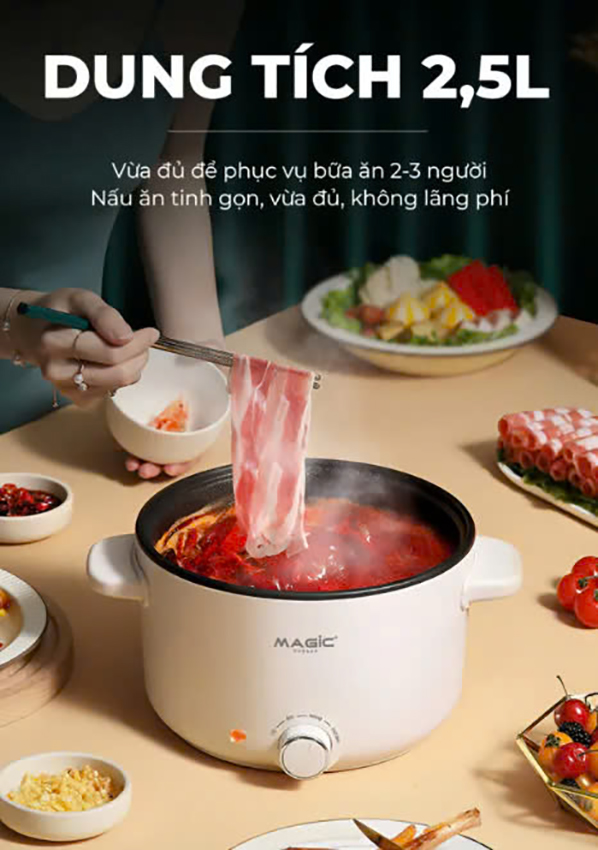 - Nồi lẩu điện Magic nấu nướng đa dạng các món ăn với dung tích 2.5 lít