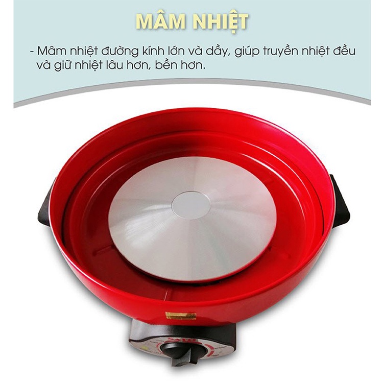 Nồi lẩu điện đa năng Sato 35NL31 thiết kế với gam màu đỏ nổi bật, có cấu tạo gồm 2 lớp: Vỏ bằng hợp kim nhôm phủ