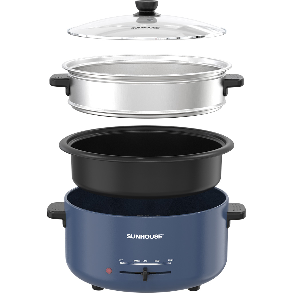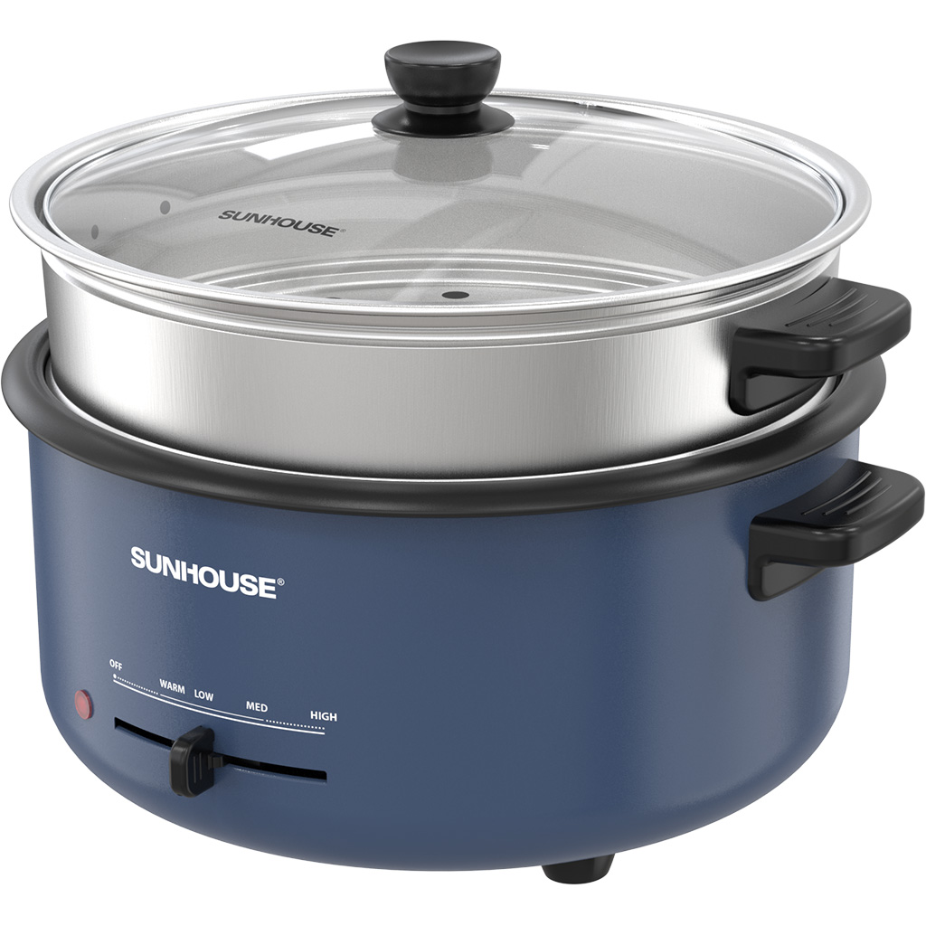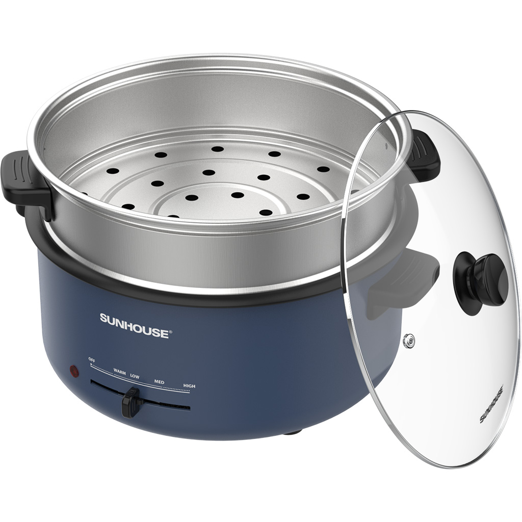 Nồi lẩu điện Sunhouse nấu nướng đa dạng các món ăn với dung tích 3.5 lít Thiết kế gọn với xửng hấp phía trên tiện lợi cho bạn nấu và hấp cùng lúc Công suất 1300W nấu chín thức ăn nhanh, tiết kiệm thời gian Màu sắc trang nhã, tinh tế, không bám bẩn, dễ vệ sinh Núm gạt điều chỉnh nhiệt độ dễ dàng tuỳ theo nhu cầu sử dụng Nắp nồi trong suốt, có thể quan sát khi nấu, tay cầm cách nhiệt
