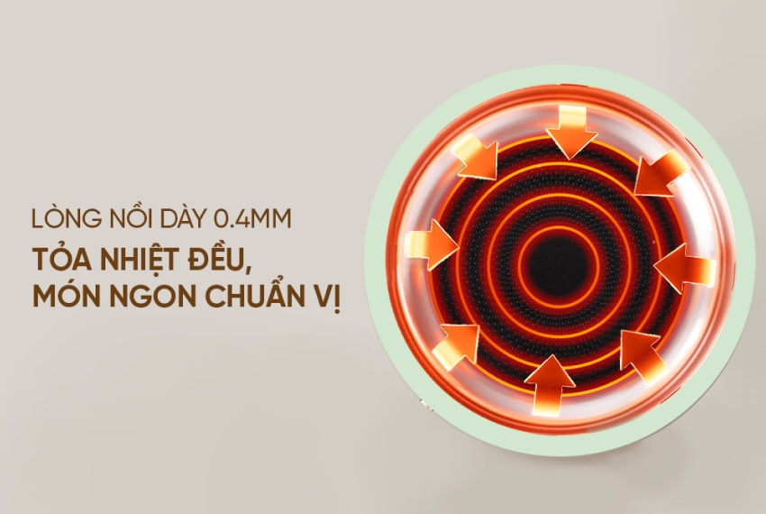 - Lòng nồi dày 0.4mm, tỏa nhiệt đều, món ngon chuẩn bị