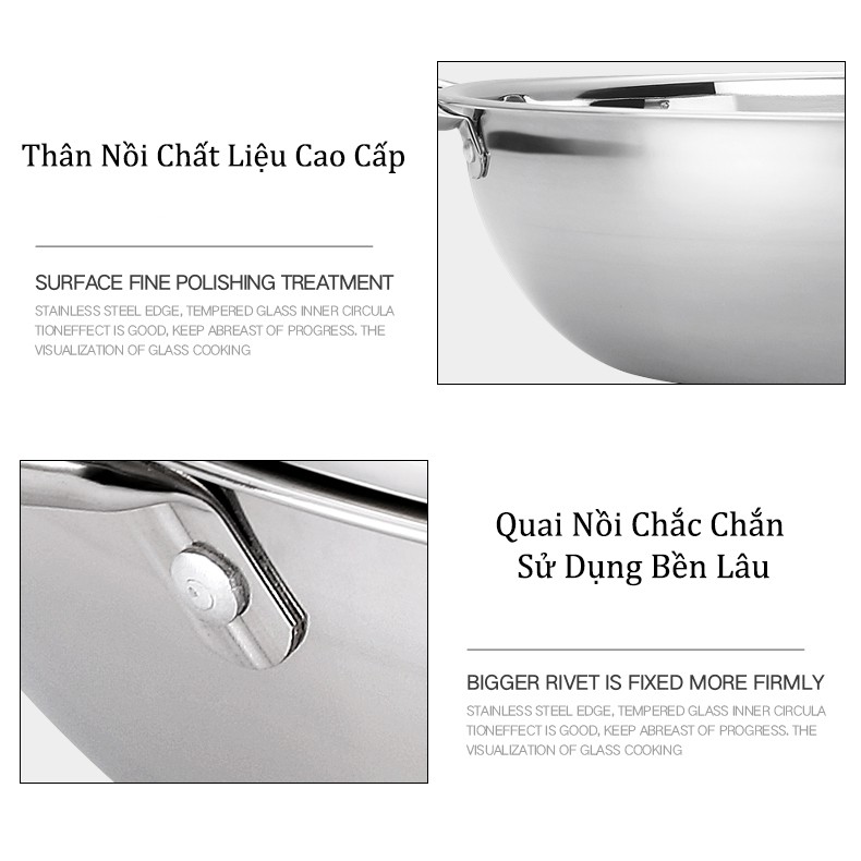 Thiết kế nắp đậy bằng kính vừa khít với nồi vừa quan sát được thực phẩm trong khi dùng tránh tình trạng sôi quá trào ra ngoài do không quan sát được như nồi thôi thường