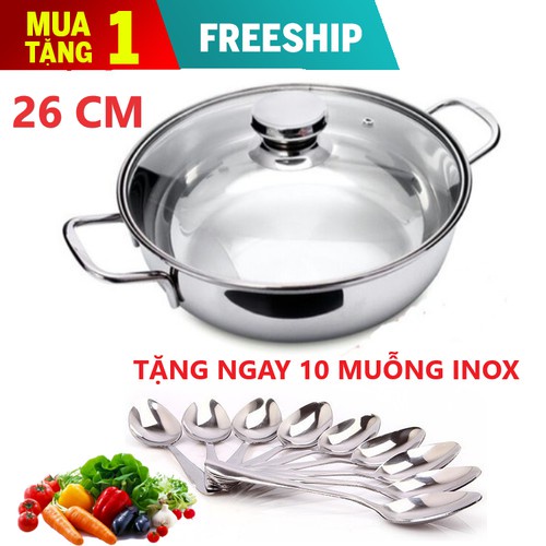 CHI TIẾT SẢN PHẨMNỒI LẨU INOX NẮP KÍNH SIZE 26CM CÓ TAY CẦM CÁCH NHIỆT VÀ TẶNG 10 MUỖNG