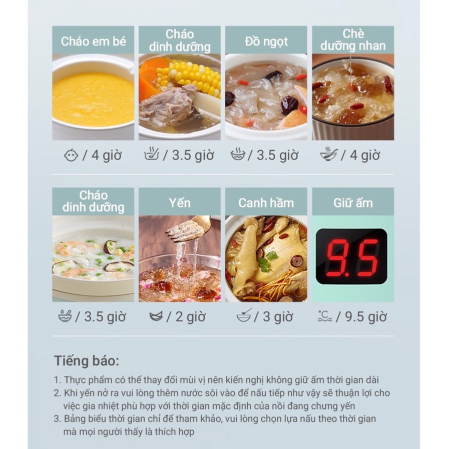 Ngoài chức năng nấu cháo, hầm canh, chưng yến và làm các loại bánh ngọt cũng giúp chị em phụ nữ cũng có thể các tính năng khác của máy như chưng yến, hầm gà, hấp rau củ quả..v.v để thực hiện những món ăn bổ dưỡng cho gia đình mình. Thời gian giữ ấm thức ăn có thể lên đến 9.5 giờ đảm bảo bữa ăn luôn nóng sốt, thơm lừng và tròn vị.