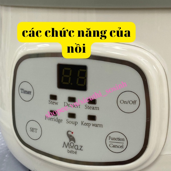 Bước 3: Đối với nồi nấu cháo chậm Moaz Bébé thì có các tính năng chính gồm: Nấu cháo, hấp, hầm canh, chưng yến, súp chè, giữ ấm, hẹn giờ,….Tùy vào thực phẩm cần nấu là cháo hay canh hay chè,… thì các mẹ cần chọn tính năng phù hợp với món ăn đó nhé!