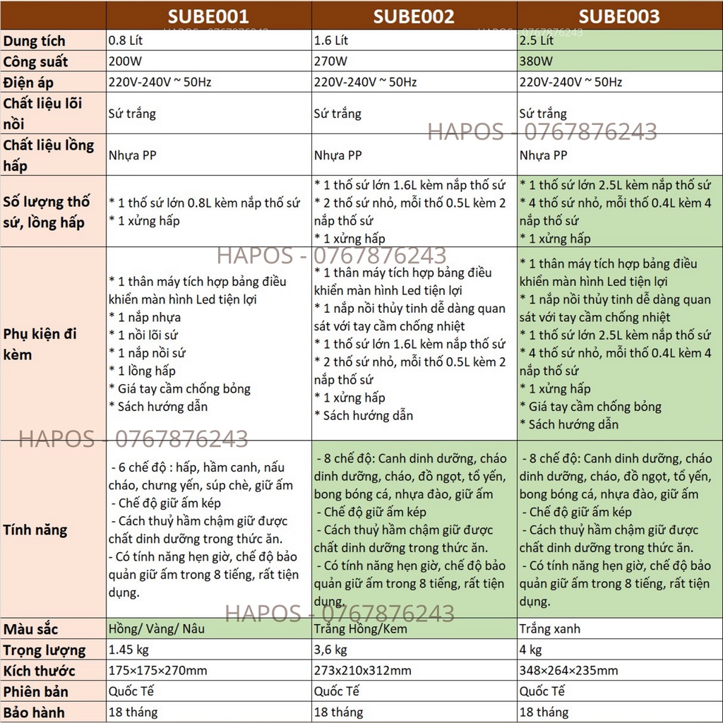 - Nồi nấu cháo chậm Bear SUBE001 có tổng dung tích nồi sứ 0.8L (nồi sứ lớn 0.8L).