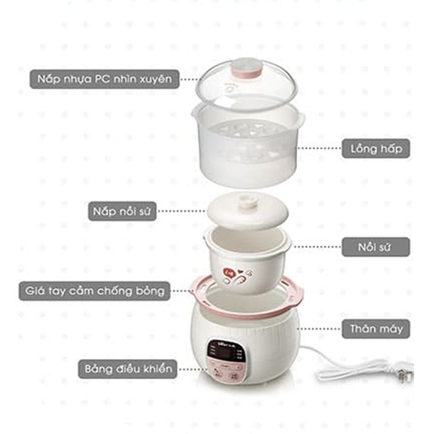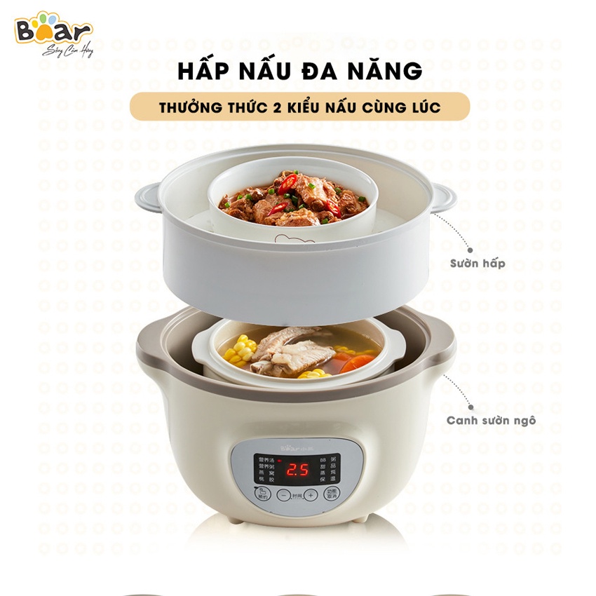 Nồi Nấu Cháo Chậm Cho Bé Bear dung tích 0.8L, 1.6L, 2.5L kèm lồng hấp (1 đổi 1 trong 30 ngày, Bảo hành 18 tháng)