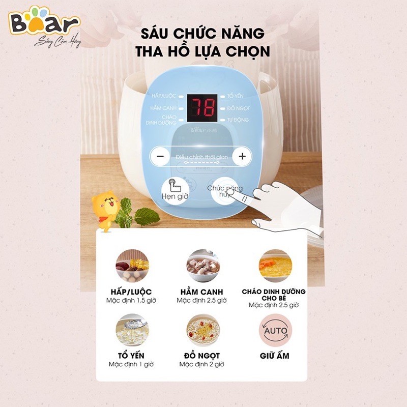 ĐẶC ĐIỂM NỔI BẬT NỒI NẤU CHÁO CHO BÉ BEAR DDZ-B08C1 CHÍNH HÃNGTính năng hẹn giờ đặc biệt tiện lợi và khác biệt so với các dòng sản phẩm khác Với tính năng hẹn giờ , khâu chuẩn bị cho bữa cơm đã được thảnh thơi hơn rất nhiều. Đêm đặt sáng ăn, hay sáng đặt tối ăn. Có chế độ bảo quản giữ ấm trong 8 tiếng, rất tiện dụng