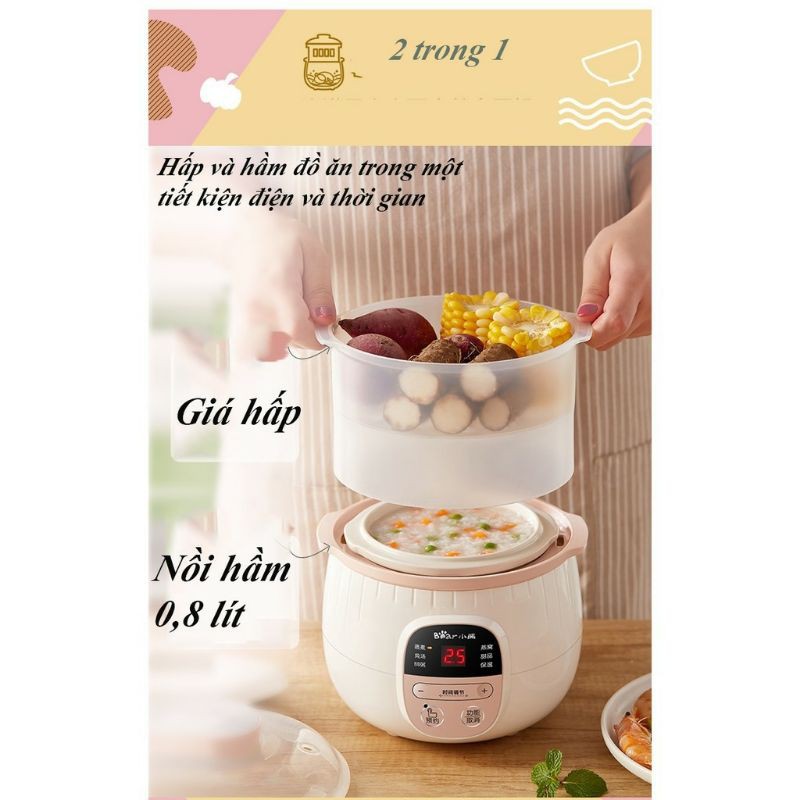 Nồi nấu chậm Bear 0.8L bản nội địa Trung thích hợp với gia đình có con nhỏ ăn dặm, nấu cháo, hấp thức ăn rau củ cho bé tập ăn ....Không lò trào hay cháy