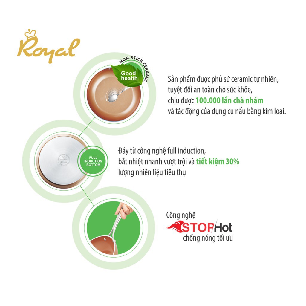 Đặc biệt, quai Royal Premium sản xuất theo công nghệ Stophot cách nhiệt 100%, bạn có thể nấu nướng thoải mái mà không lo bị bỏng. Với chất liệu Inox 304 bền bỉ, chống ăn mòn, cán chảo thiết kế thon gọn tạo nên tính thẩm mỹ nhưng vẫn đảm bảo sự chắc chắn sẽ là lựa chọn hoàn hảo cho nhà bếp của bạn