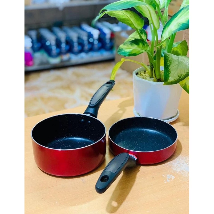 - Chất liệu: chảo và nồi được làm từ hợp kim nhôm, ưu điểm nhẹ và dẫn nhiệt nhanh. Đáy thiết kế 4 lớp giúp chế biến thức ăn ngon hơn. Bề mặt sử dụng công nghệ chống dính Marble giúp bề mặt chống dính chắc, bền hơn, không dễ bị chày xước. Có nắp đậy đi kèm. Sử dụng được các loại bếp bao gồm cả bếp từ