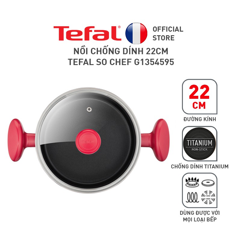 Nồi Tefal So Chef - Lớp phủ bền chắc, độ bền xuất sắc.Nồi, chảo Tefal So Chef thiết kế từ Pháp được làm bằng hợp kim nhôm cao cấp với màu đỏ sang trọng bên trong là phủ lớp chống dính Titanium Reinforced, thích hợp cho nhiều kiểu nấu nướng, sử dụng được trên bếp từ.