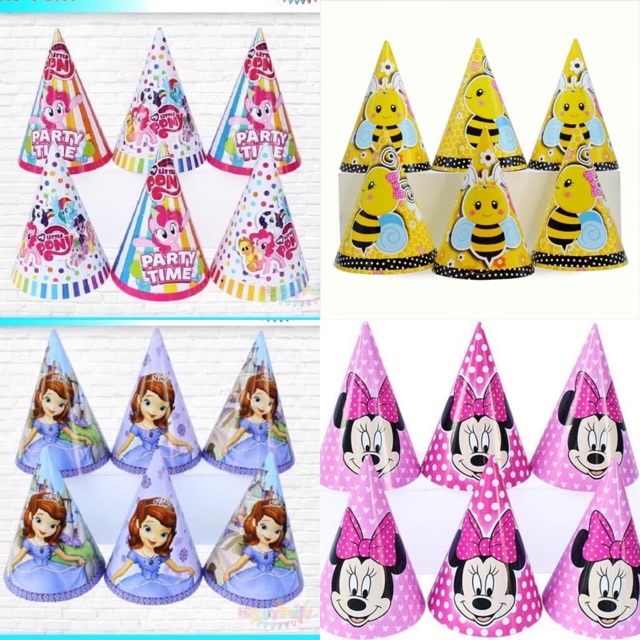 -Nón sinh nhật bé gái nhiều mẫu hoạt hình đáng yêu .- Chất liệu giấy cứng màu in rõ đẹp.