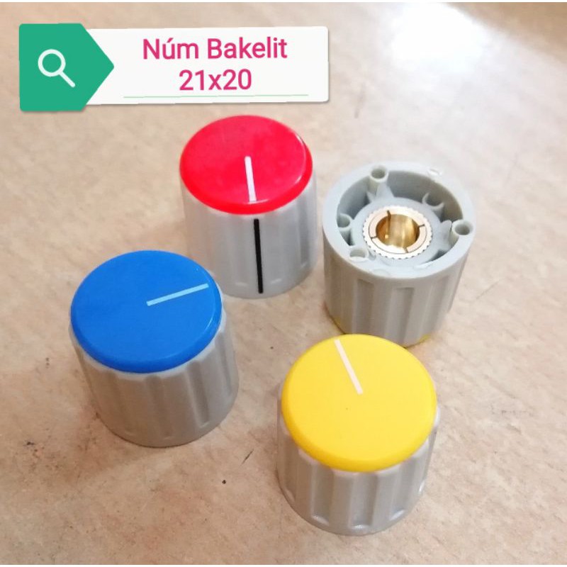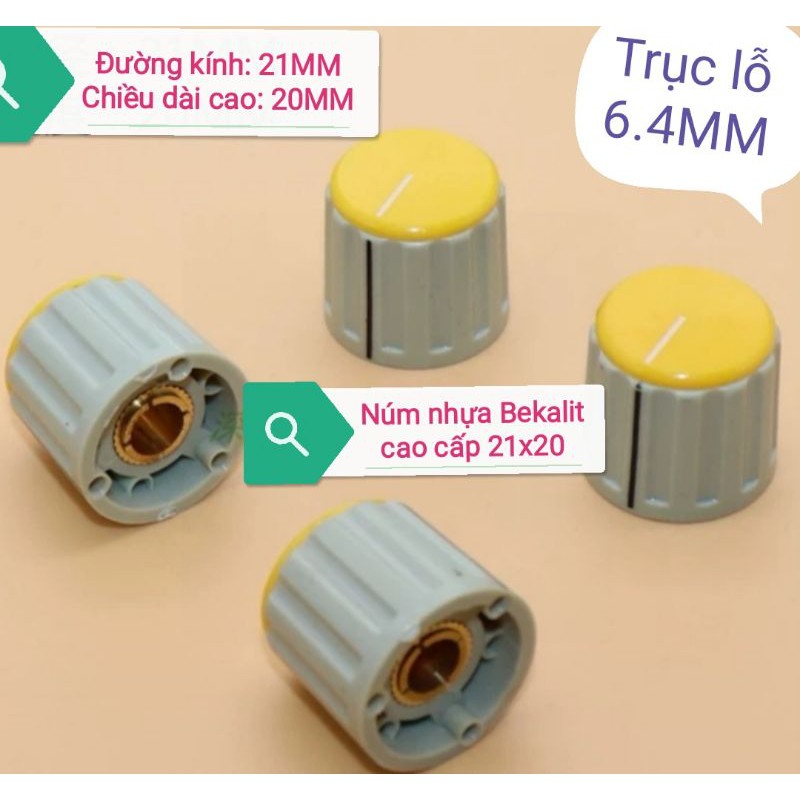 Núm nhựa Bekalit cao cấp 21 x 20 đường kính lỗ đồng 6.4MM phù hợp cho, encoder, Biến trở volume Biến trở vi chỉnh v. V. trục kim loại tròn như 3590SKích thước cao 20MM, đường kính đáy 21MM. Lỗ trục đồng sâu 6.5MM, giữ trục kiểu côn thu, Có ốc siết từ trên xuống.