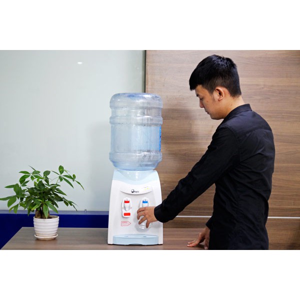 - Với cây nước nóng lạnh để bàn với thiết kế nhỏ gọn nên được tinh gọn, tối giản, không có bộ phận khoang chứa phía dưới. Vì thế bạn có thể đặt trên bàn để tiết kiệm diện tích văn phòng hay nhà ở của mình.