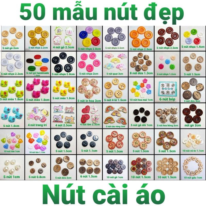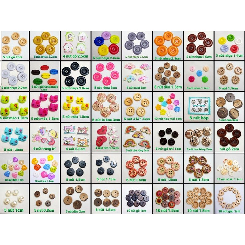 Nút làm bằng nhựa và gỗ nhẹ, bóng đẹp. Thích hợp làm nút gài áo hoặc trang trí các sản phẩm hangmade. Size từ 1.5cm đến 3cm. Size nhỏ 1 túi 10 nút. Size lớn 1 túi 5 nút. Giá 5k/1 túi. 10 túi 40k. Chọn kiểu theo hình nút.#nut