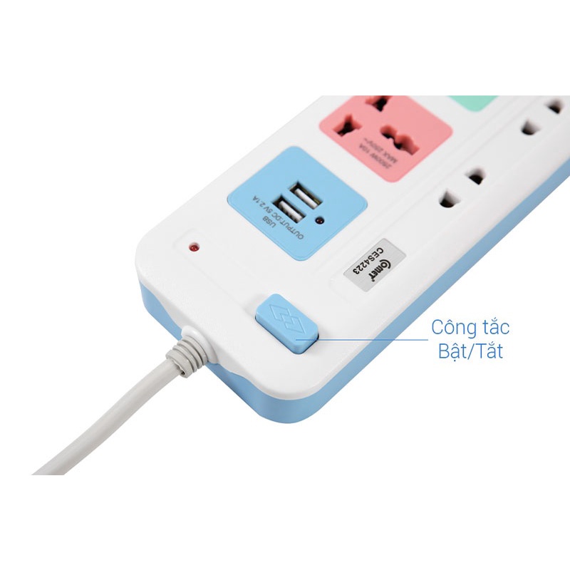 +++ Ổ cắm điện COMET 2USB 4 lỗ 3m COMET có kiểu dáng đơn giản , nhiều màu sắc bắt mắt, kích thước nhỏ gọn, chỉ 250g tiện di chuyển.+++ Ổ cắm điện có 2 lỗ cắm 3 chấu, 2 lỗ cắm 2 chấu thêm 2 cổng USB cho bạn sử dụng thiết bị có đầu phích dạng tròn, dẹp, 3 chấu, USB... đa dạng, dễ dàng.
