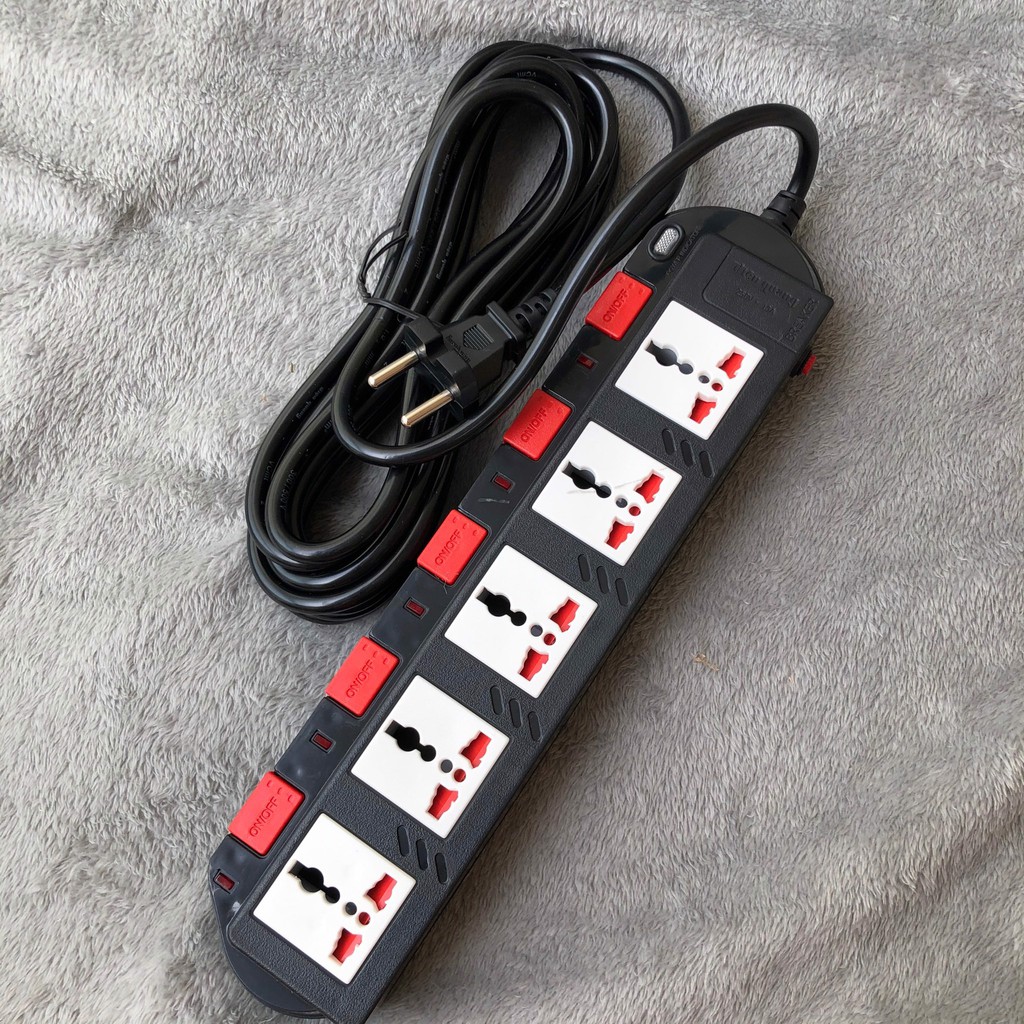 - Số ổ cắm: 5 ổ cắm 3 chấu đa năng (cắm được các loại phích cắm phi 4, phi 5, dẹp, 3 chân thẳng nhỏ... )