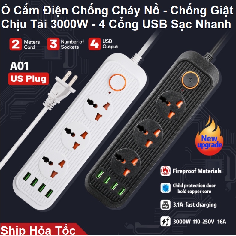 Ổ Cắm Điện Chống Cháy Nổ - Chống Giật - Tích Hợp 4 Cổng USB Sạc Nhanh QC3.0 - Chịu Tải 3000W - Bảo Hành 12 ThángSự chỉ rõ: