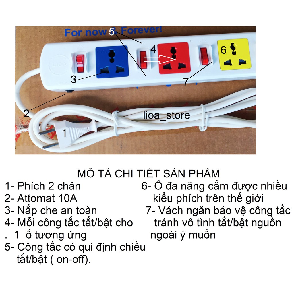 -Thân ổ cắm màu (đen và trắng) có gắn thương hiệu LiOA . Mỗi ổ cắm mang 1 màu sắc khác nhau giúp cho người SD phân biệt dc dễ ràng khi dùng nhiều thiết bị cùng 1 lúc. trên mỗi mặt nắp nhựa ổ cắm đều có chữ LiOA. ( để tránh hàng giả hàng nhái).ĐẶC BIỆT là các ổ cắm dều có nắp che AN TOÀN . ( tránh trường hợp nhà có trẻ con vô ý thò tay vào ổ cắm khi đang có điện . khoảng cách giữa các ổ là đảm bảo cắm dc các phích có bản to.