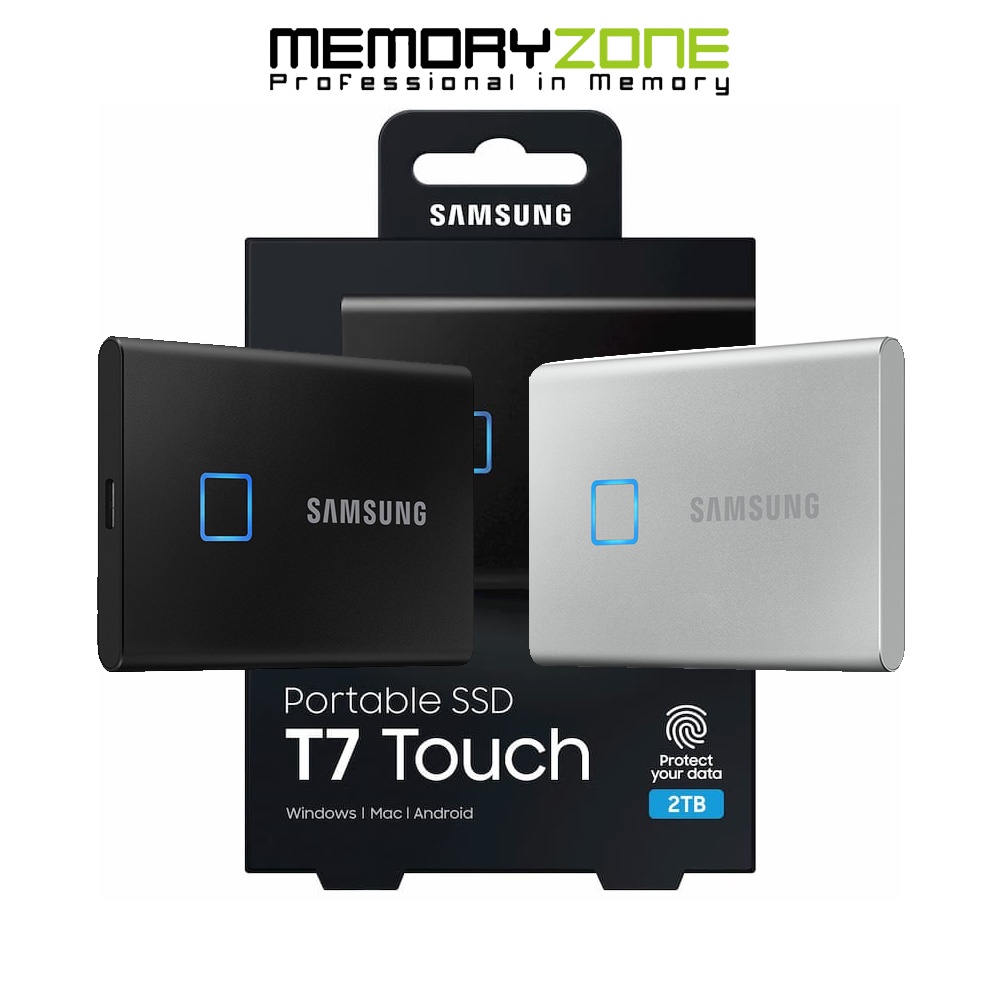Ổ cứng di động SSD Samsung Portable T7 truy cập tập tin của bạn mọi lúc, mọi nơi. T7 Touch tương thích với PC, Mac, thiết bị Android, máy chơi game, v.v. Bao gồm trong hộp là cáp USB loại C-to-C và loại C-to-A để thêm phần thuận tiện.