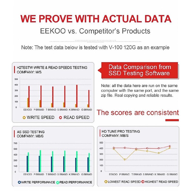 Kết quả so sánh với dữ liệu thực tế, SSD EEKOO và các sản phẩm đối thủ. Ở đây EEKOO test SSD 128GB với các đối thủ có dung lượng tương đương.