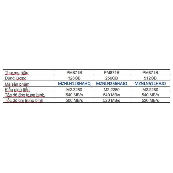 Thông số SSD Samsung PM871 M2 SATA 2280