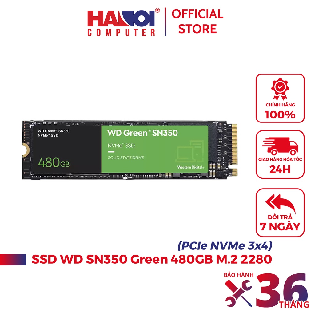 Ổ cứng SSD WD SN350 Green 480GB M.2 2280 PCIe NVMe 3x4 (Đọc 2400MB/s - Ghi 1650MB/s)-(WDS480G2G0C)