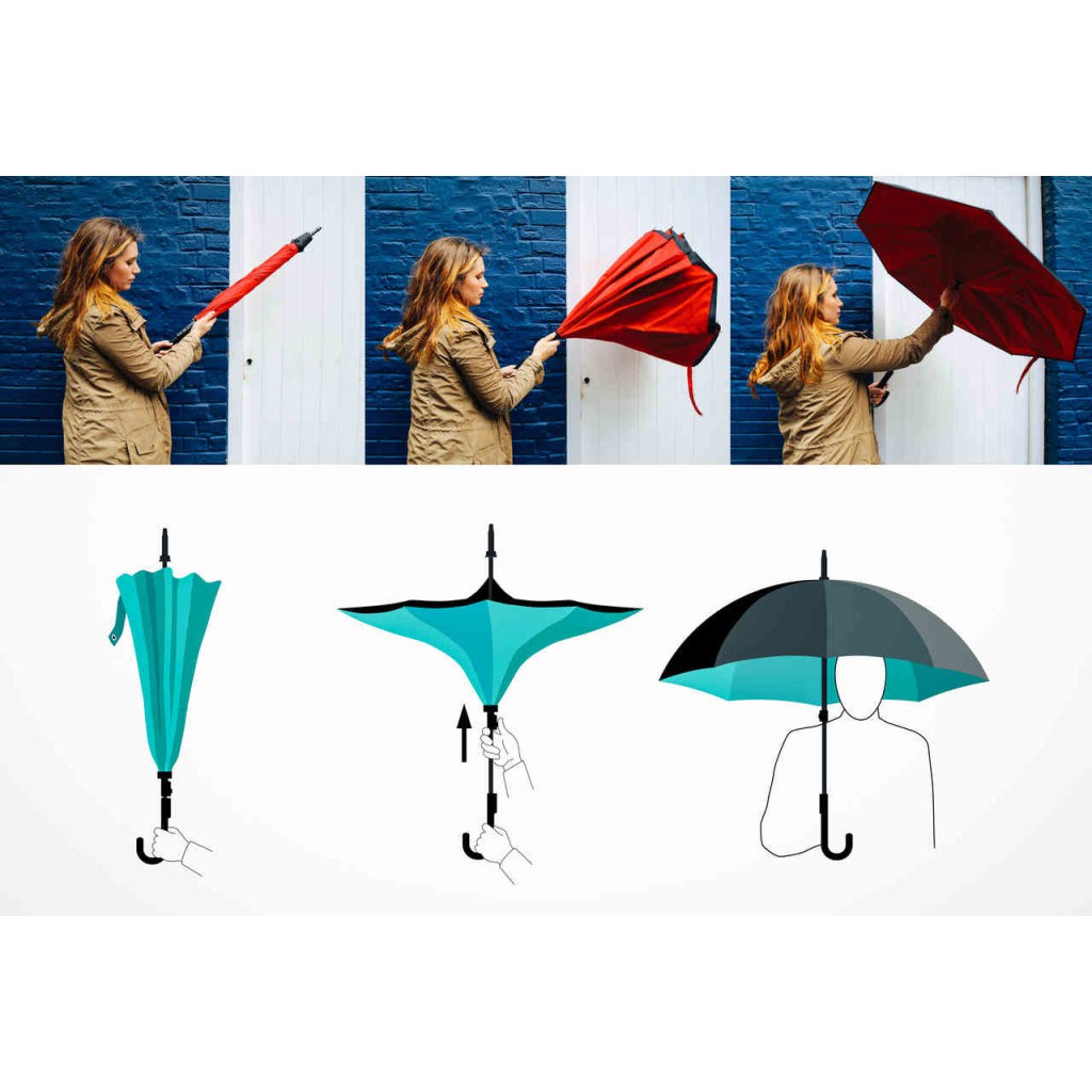 ❷ Đóng/mở dù trong không gian hẹp. Do cơ chế mở ngược của dù, khi vào xe ô tô, bạn có thể đóng dù trong khoảng khe cửa hẹp nhất mà vẫn không bị ướt. Một điểm thú vị nữa là, mặt ướt của dù đóng vào bên trong. Điều này giúp bạn có thể vô tư để dù lên ghế ngồi mà không lo ghế ướt.
