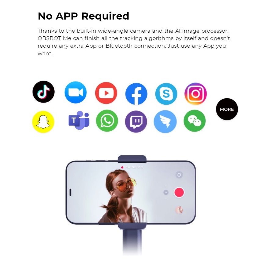 ◾ No APP Required: Nhờ có 120°Wide-angle Sensing Lens (Megapixel tích hợp và camera theo dõi thông minh) và bộ xử lý hình ảnh Al, OBSBOT Me có thể tự hoàn thành tất cả các thuật toán theo dõi và không yêu cầu thêm bất kỳ ứng dụng hoặc kết nối Bluetooth nào. Chỉ cần sử dụng bất kỳ ứng dụng nào bạn muốn như Tiktok, Youtube, Facebook, Instagram, Skype, Wechat,...