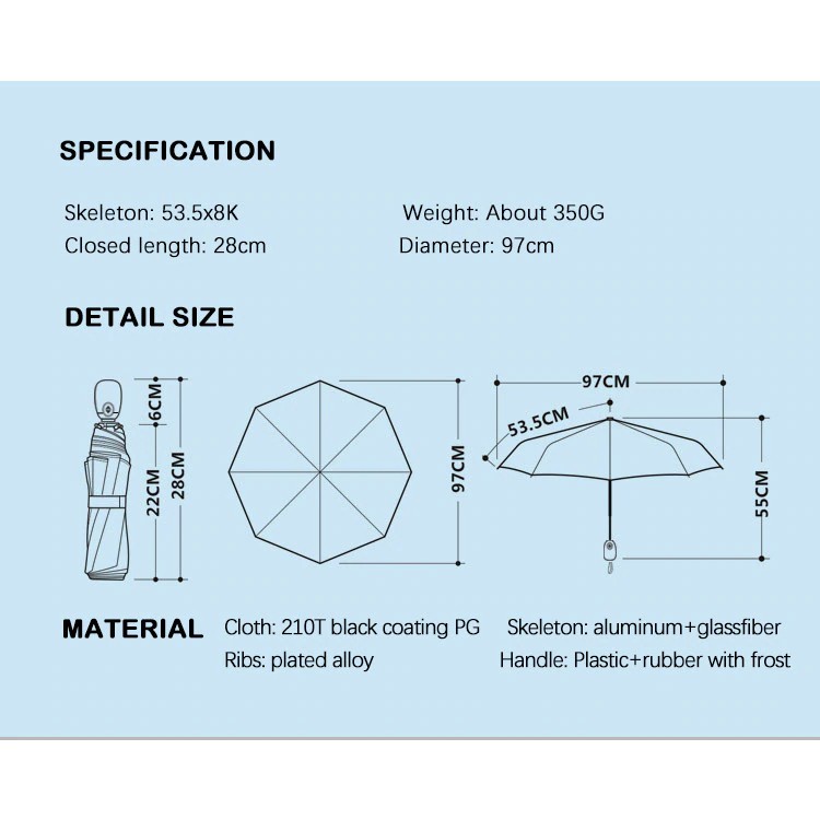 Kích thước: độ mở ô 96cm, đóng ô: 20cm