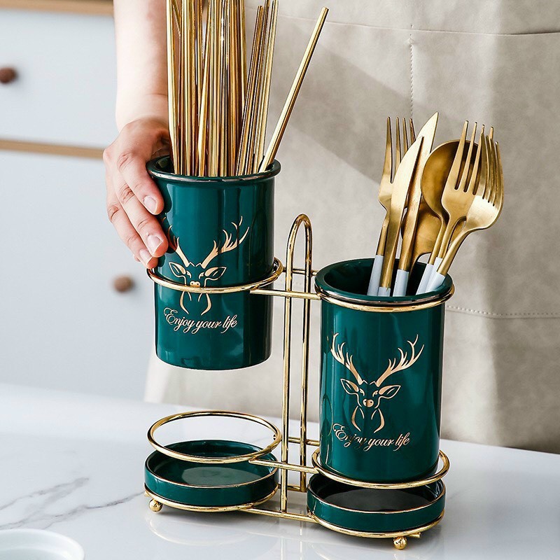 Nhà cửa & Đời sống > Bộ đồ bàn ăn > Bộ dao kéo || Ống cắm đũa sứ xanh đôi khung thép mạ vàngCòn hàng
