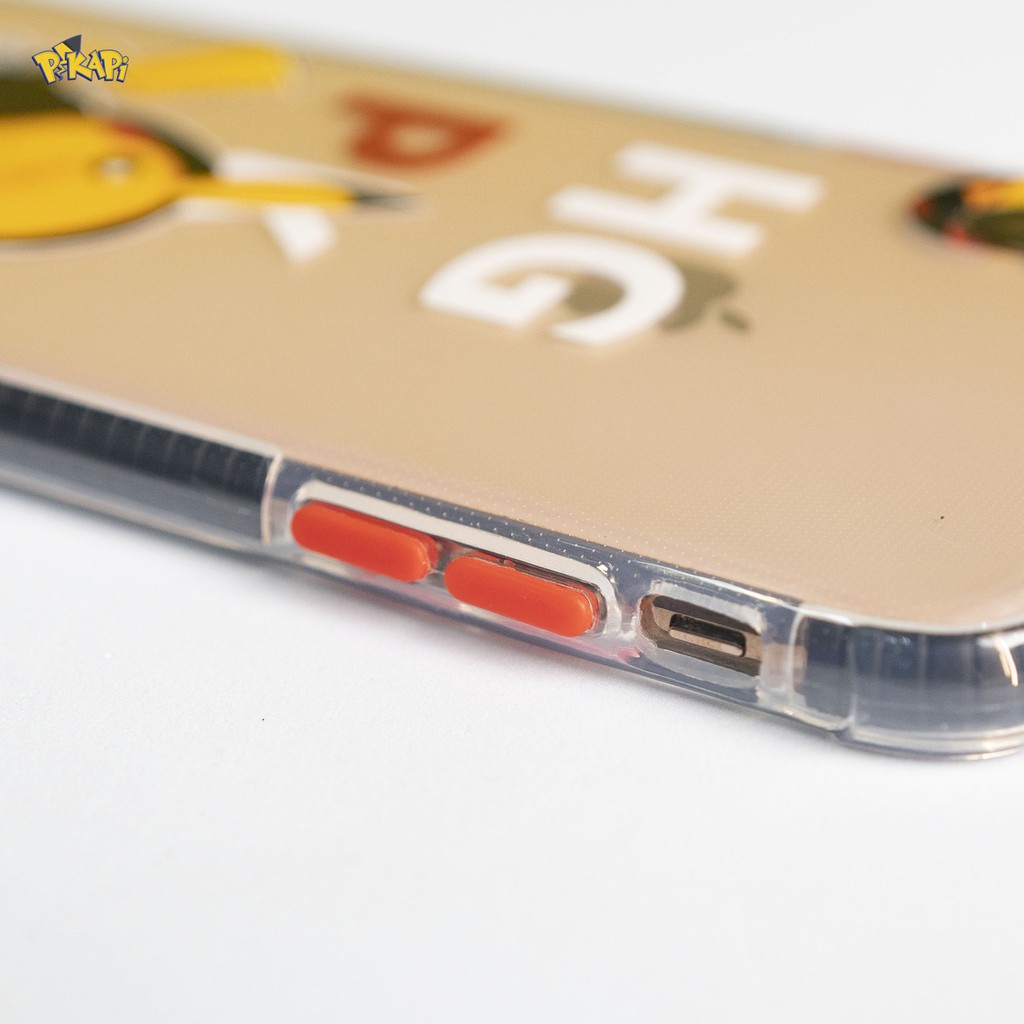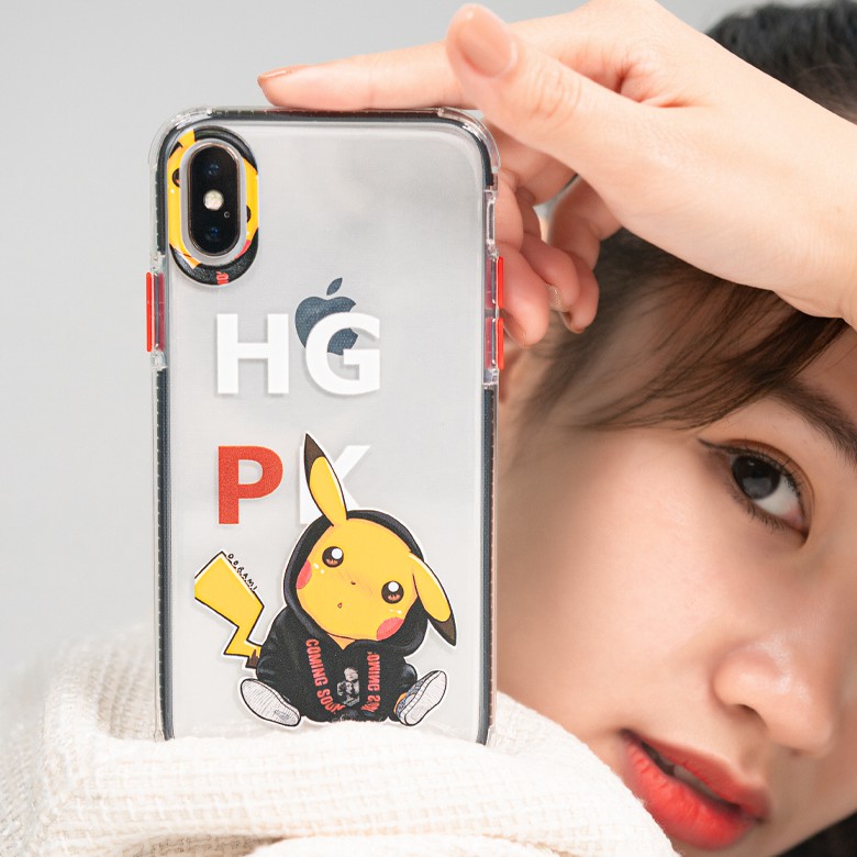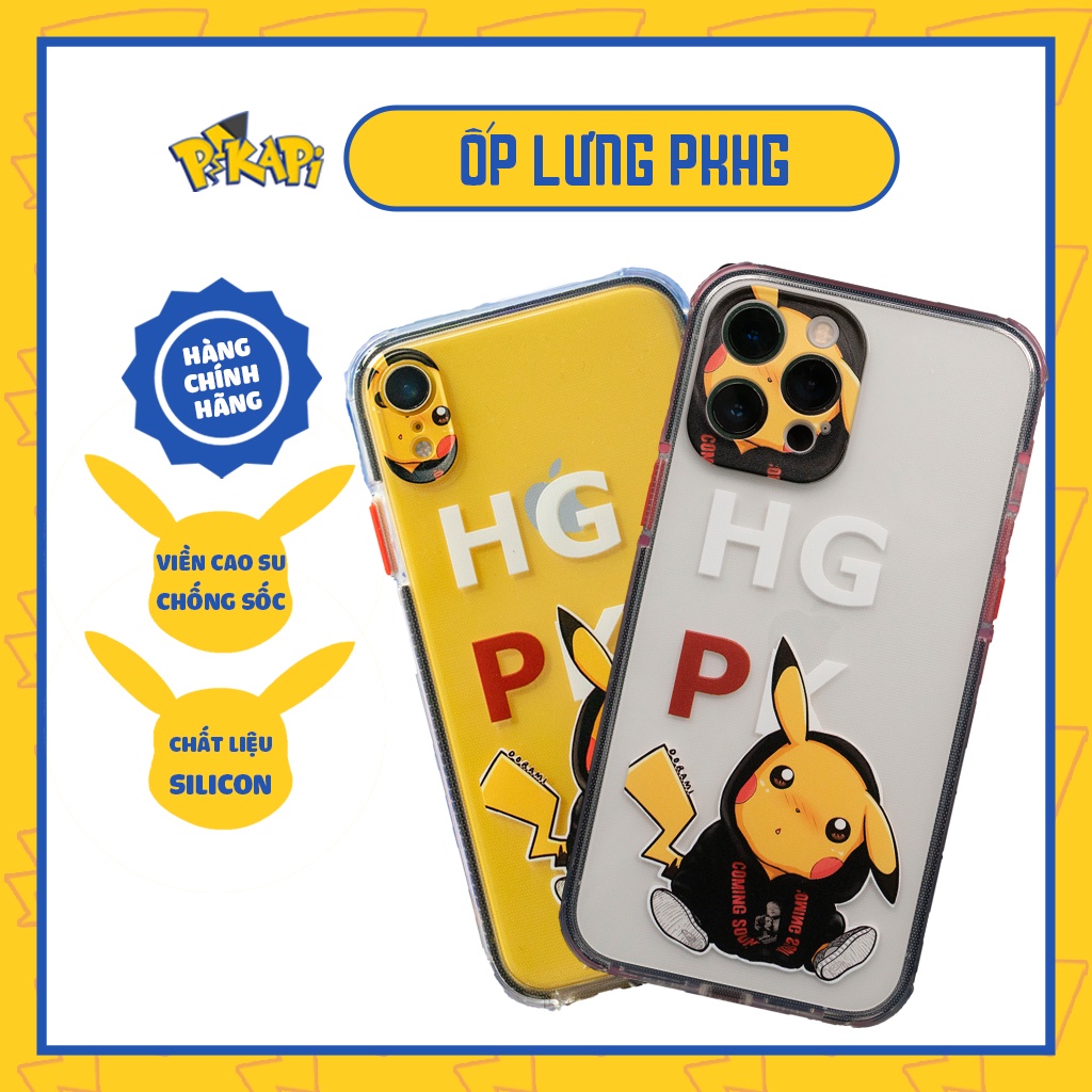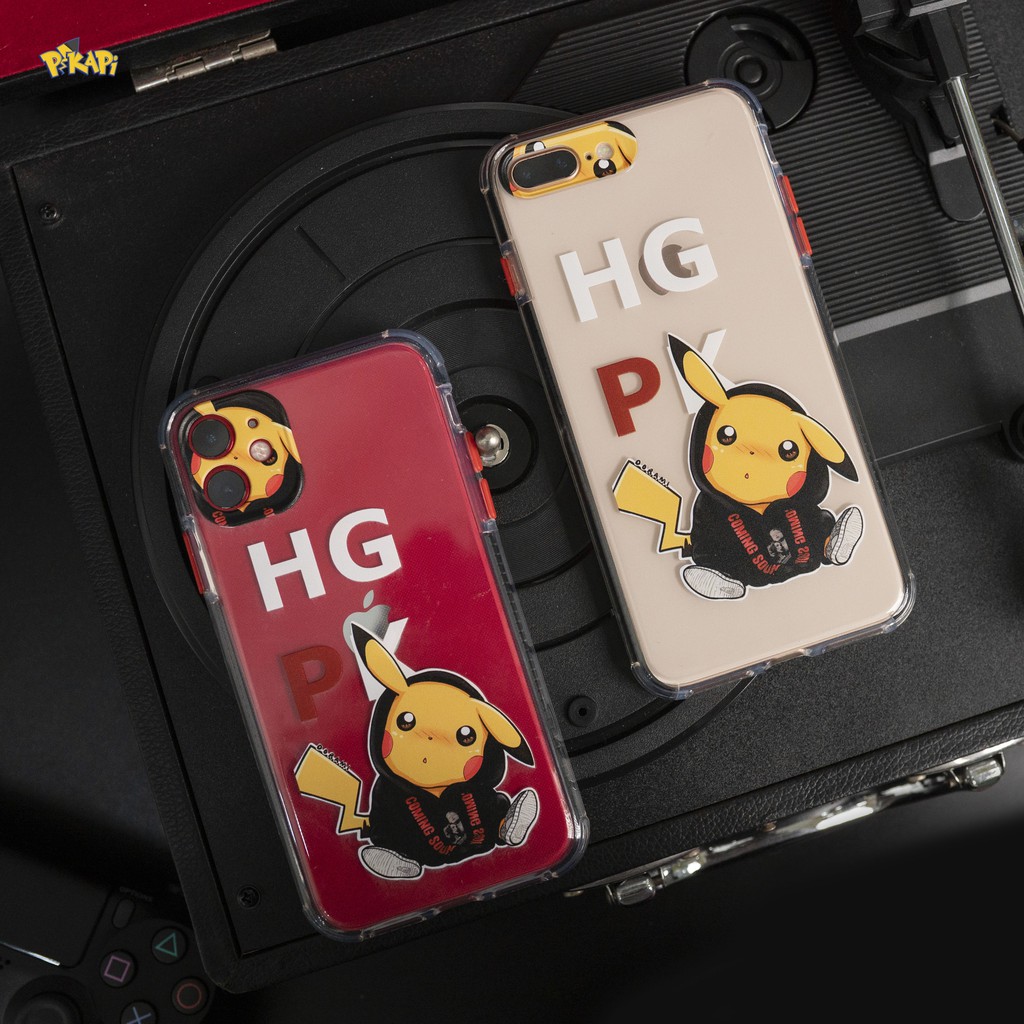 Điểm nhấn của ốp là họa tiết in hình chú Pikachu mặc áo hoodie nâu đang ngồi với đôi mắt tròn xoe, để lộ hai tai và chiếc đuôi sấm sét siêu đáng yêu cùng tên viết tắt của em nó "HGPK"- #PikachuHeartGold.
