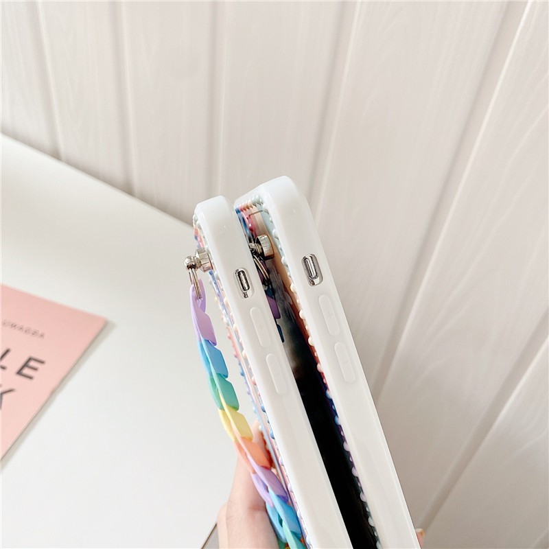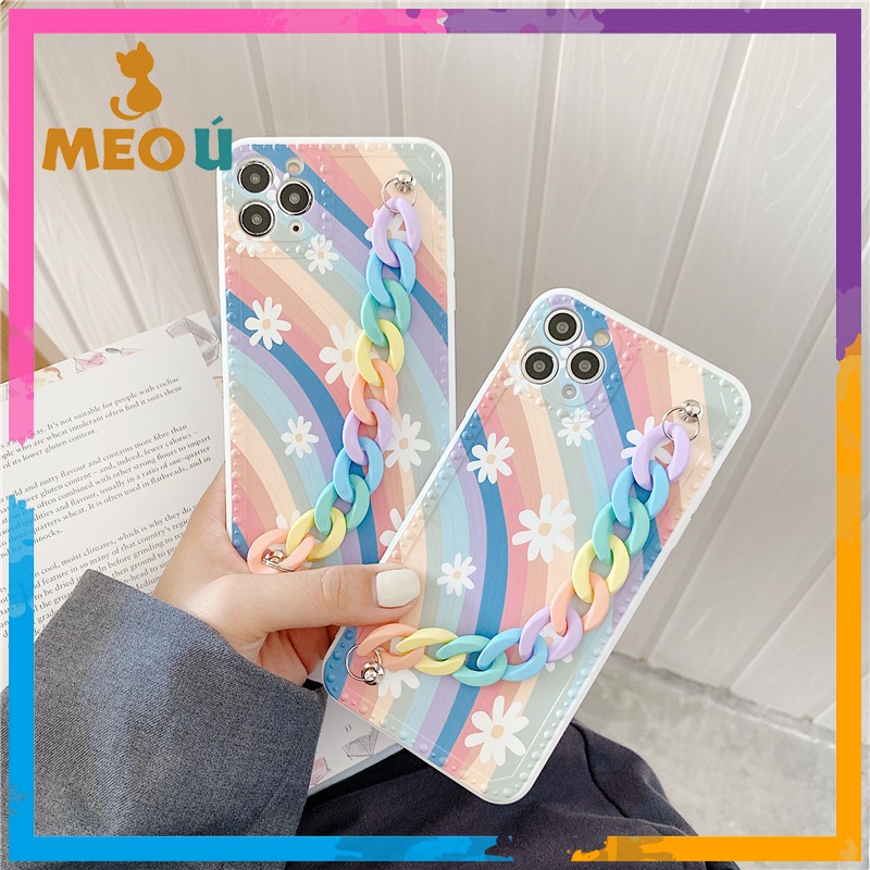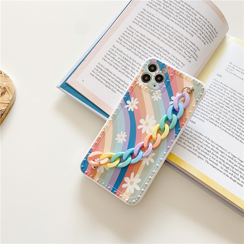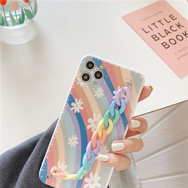 Ốp iphone họa tiết cầu vồng và hoa kèm dây đeo tay chống trơn trượt cực kì xinh xắn <3