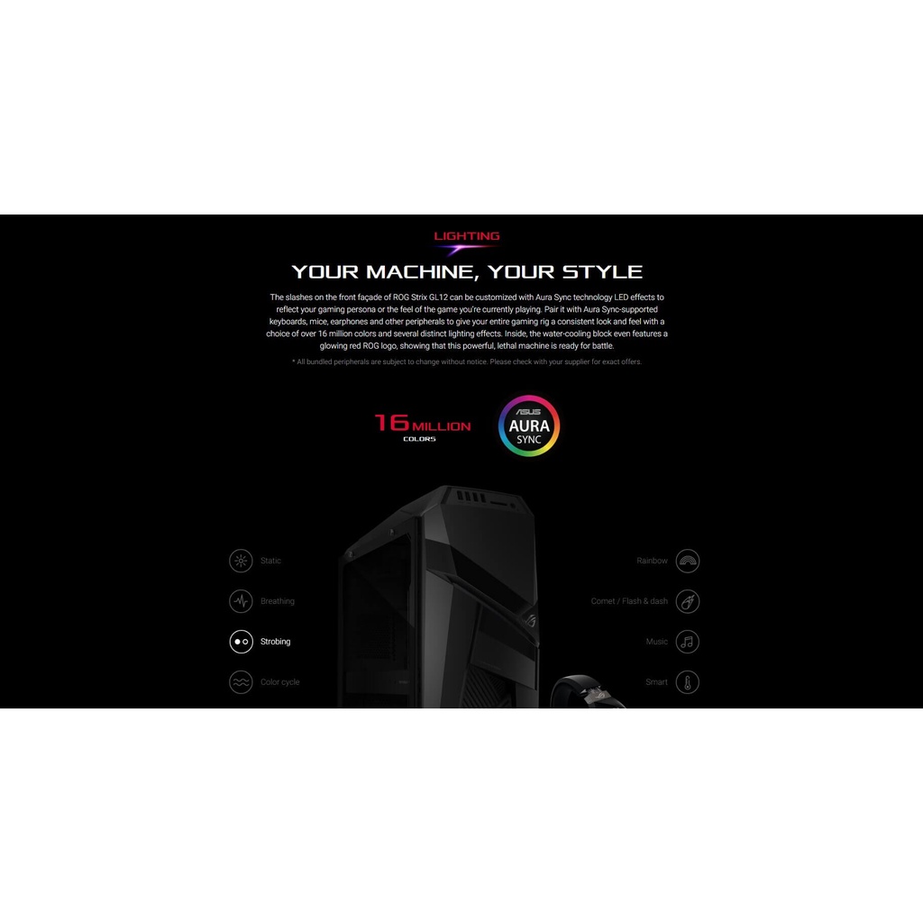 ROG STRIX GL12CM được thiết kế để làm dịu cơn khát không bao giờ dứt của game thủ về mã lực chơi game cực mạnh cùng với thiết kế nổi bật, độc đáo. Nó được cung cấp sức mạnh bởi bộ xử lý Intel® Core ™ i7-8700K thế hệ thứ 8 được ép xung tại nhà máy (lên đến 4,8 GHz đầy đủ hexa-core), với đồ họa NVIDIA® GeForce® GTX 1080 cho trải nghiệm chơi game vô tận. Nâng cấp hệ thống dễ dàng nhờ các khay mở rộng và khay SSD trao đổi nóng sẵn sàng cho thể thao điện tử. Một mặt bên trong suốt cùng với các hiệu ứng ánh sáng công nghệ Aura Sync có thể tùy chỉnh cho phép bạn thể hiện cá tính chơi game của mình từ trong ra ngoài.