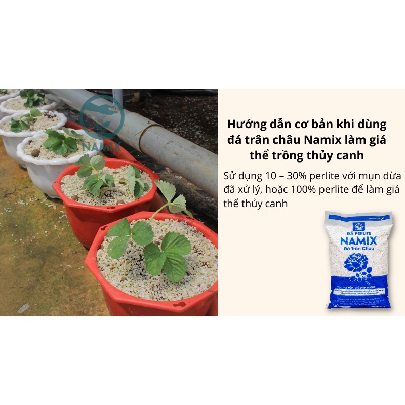 Đá perlite Namix chuyên dùng để trồng hoặc trộn giá thể trồng cây: Hoa hồng, xương rồng, sen đá, hoa lan, trồng rau thuỷ canh và trồng rau mầm.Với cấu trúc thể hang nên nó có thể ngậm nước, chất dinh dưỡng, điều hòa nhiệt độ, độ ẩm cho đất, giá thể trồng. Giúp cho đất, giá thể tơi xốp thoáng khí giúp cho bộ rễ phát triển mạnh, thích hợp để trồng hoa, trồng lan, trồng hoa hồng, hoa sen đá….