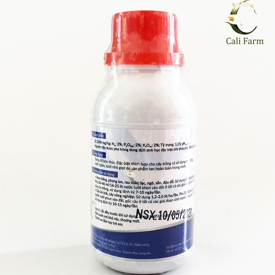 🌱 Thành phần: B: 2000mg/kg, Nts: 2%, P2O5hh: 2%, K2Ohh: 2%, Tỷ trọng: 1,25; pH nước: 7