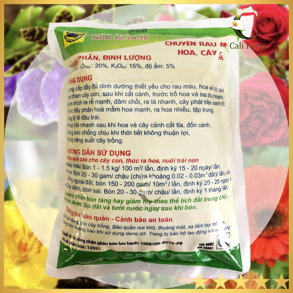 🌼Thành phần: Nts 20 %, P2O5hh 20 %, K2Ohh 15 %, + TE (MgO, Cu, Zn): 300 ppm.