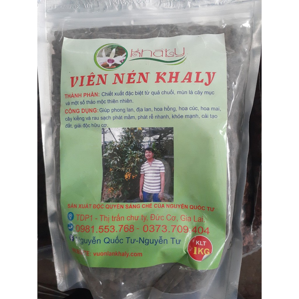 Phân bón hữu cơ vi sinh dạng viên nén Khaly túi 1kg tốt cho mọi cây trồngTHành phần: Chiết xuất đặc biệt từ quả chuối, mùn lá cây mục và một số thảo mộc thiên nhiên.
