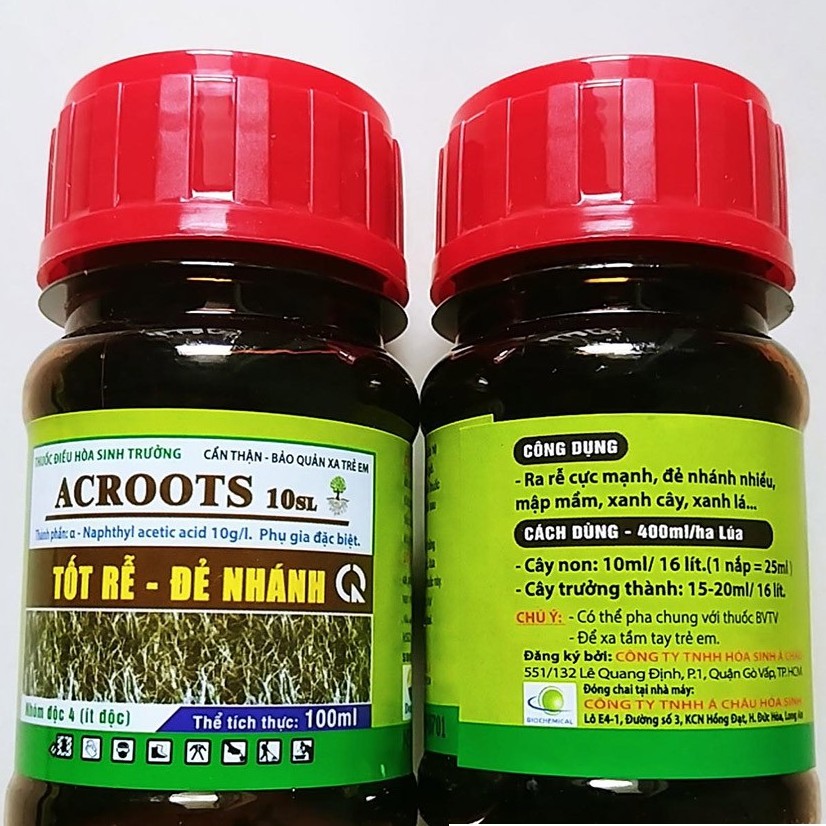 Phân Bón Lá ACROOTS 10SL - Tốt Rễ Đẻ Nhánh 100mlThành phần: α – Naphthyl Acetic Acid 10g/L. Phụ gia đặc biệt.