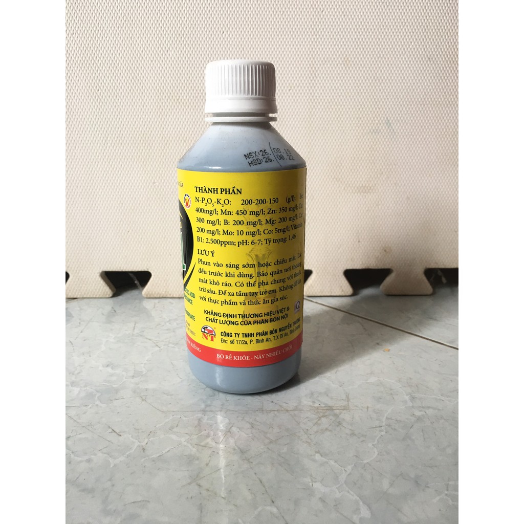 Công dụng: * Có phát hoa dài, trên đó có nhiều hoa to, màu sắc đẹp rực rỡ, lâu tàn. * Sung sức, tăng khả năng đề kháng, chống lại sâu bệnhCách Dùng: * Pha 8-10cc cho 1 bình xịt 8 lít nước. * Phun đều trên lên trên và dưới mặt lá, phun vào rễ và các giá thể. Phun định kỳ 5-7 ngày 1 lần. * Riêng đối với các lọai Hoa Kiểng, pha 8-10cc cho 1 bình xịt 8 lít nước. Phun định kỳ 15 ngày 1 lần. Thành phần: * (N) 200g/l, (P2O5) 200g/l, (K2O) 150g/l, (Fe) 0,2%, (Mo) 10mg/l, (Mn) 450mg/l, (Zn) 350mg/l * (Cu) 300mg/l, (Ca) 200mg/l, (Mg) 200mg/l, (B) 200mg/l, (Co) 5mg/l * (Vitamin B1) 2500ppm, (Polyhydroxydioic acid) 1,5% * (Aminotriethanoic acid) 3,5%, (Alpha-Naphthalene acetic acid) 800ppm