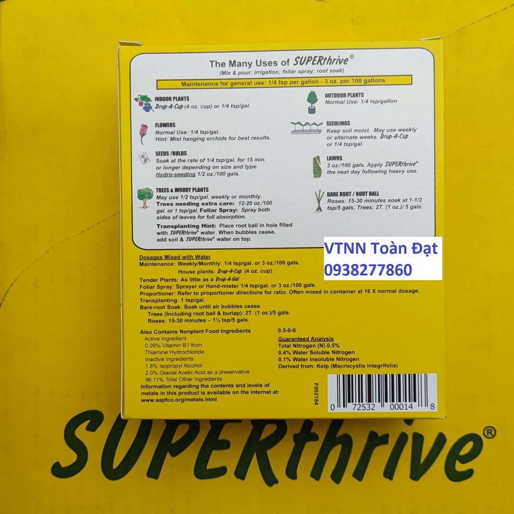 SuperThrive Có thành phần là các chất vitamins và các hormon thực vật kích thích tăng trưởng cho cây trồng