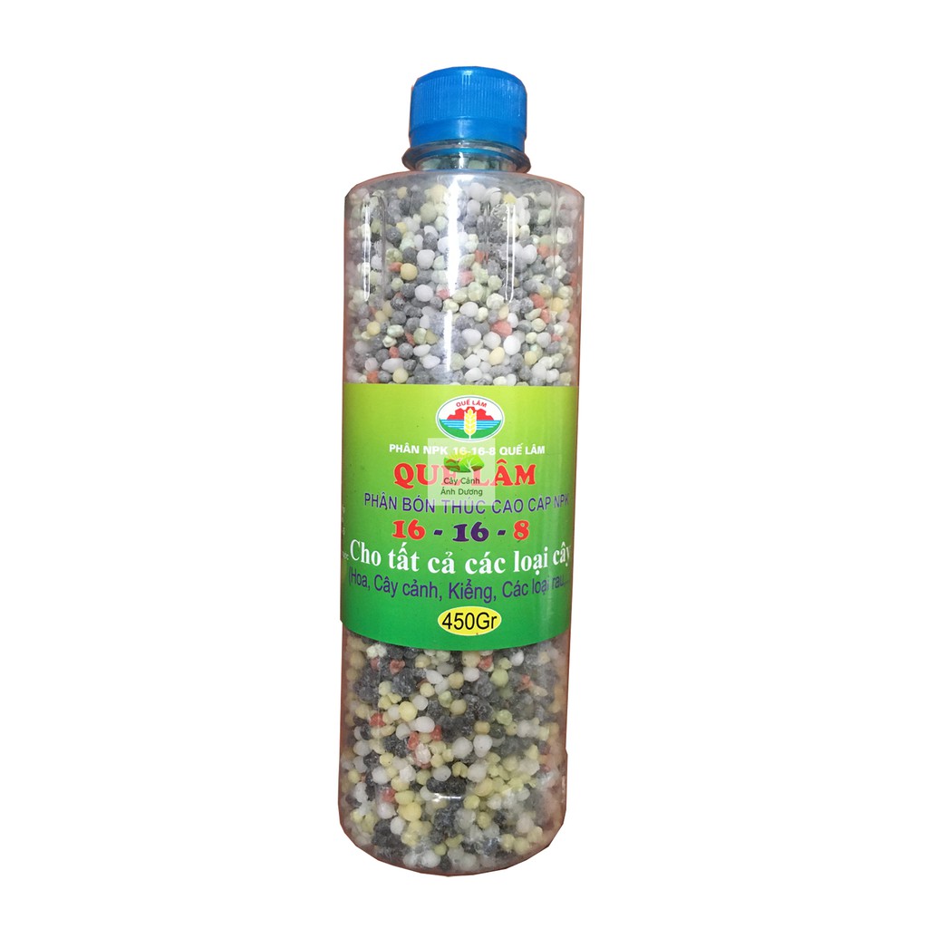 - Phân bón thúc cao cấp Quế Lâm NPK 16-16-8 450g có dạng hạt, phù hợp sử dụng cho tất cả các loại cây hoa, cây cảnh, các loại rau...