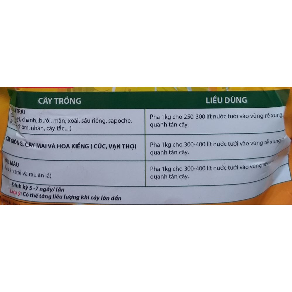 Pha 1kg cho 250 - 300 lít nước tưới vào vùng rễ xung quanh tán cây.
